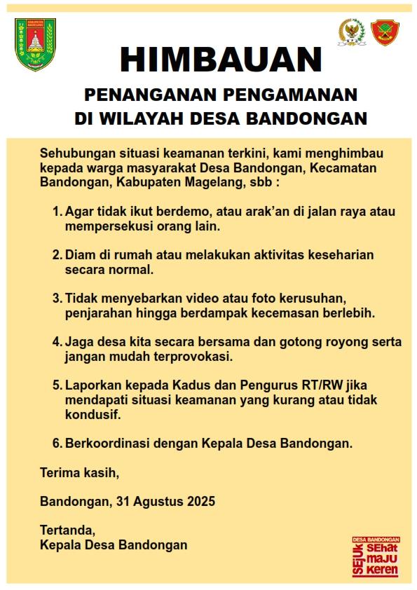 Pemerintah Desa Bandongan Keluarkan Himbauan Pengamanan Wilayah Terkait Rencana Aksi Demo 1–5 September 2025